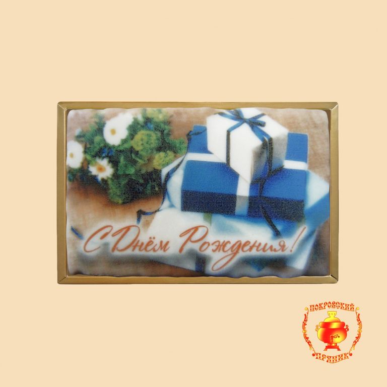 Состав продукта:;; Мука пшеничная в/с, сахар, вода, маргарин, соль пищевая, какао порошок, корица, ванилин натуральный, лимонная кислота, молоко цельное сгущенное с сахаром, грецкий орех, глазурь кондитерская молочная,кондитерский крем.;; Вес;; 160 г.;; Габариты (ВxШxГ);; 7Х11см.: см.;; Срок годности;; 6 месяцев;; Упаковка;; Подарочная прозрачная упаковка из пластика;; Начинка;; Вареное сгущенное молоко с грецким орехом;; Классический пряничный корж с начинкой из вареного сгущенного молока и грецких орехов, облитый белой шоколадной глазурью с нанесением фотопечати любой сложности порадует Вас и Ваших близких своей оригинальностью и неповторимостью. При нанесении фотопечати используются только натуральные красители. Пряник упаковывается в прозрачную пластиковую подарочную коробку