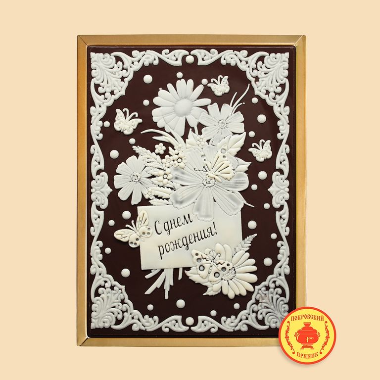 Состав продукта:;; Мука пшеничная в/с, сахар, вода, маргарин, соль пищевая, какао порошок, корица, ванилин натуральный, лимонная кислота, молоко цельное сгущенное с сахаром, грецкий орех, глазурь кондитерская молочная,кондитерский крем.;; Вес;; 600 г.;; Габариты (ВxШxГ);; 22x16 см.: см.;; Срок годности;; 6 месяцев;; Упаковка;; Подарочная прозрачная упаковка из пластика;; Начинка;; Вареное сгущенное молоко с грецким орехом;; Вы не знаете что подарить близким к приближающимся праздникам? Или Вы просто собираетесь пойти в гости и выбираете презент? Наша компания предлагает Вам уникальный продукт, который вы не найдете нигде - Пряник в шоколаде! Традиционное тесто, изготовленное и выпеченное по старинным русским рецептам, покрывается слоем шоколадной глазури «Премиум» класса на которую наносится тематический рисунок, а Внутрь толстый слой начинки из вареной сгущенки и грецких орехов, такой характерный для Покровского пряника. Наш сладкий сувенир будет незабываемым подарком к любому празднику, торжеству, юбилею, корпоративу. Ваши родные и близкие, друзья, партнеры по бизнесу высоко оценят изысканный и неповторимый вкус Покровского пряника. Пряник в шоколаде - и вкусно, и оригинально!