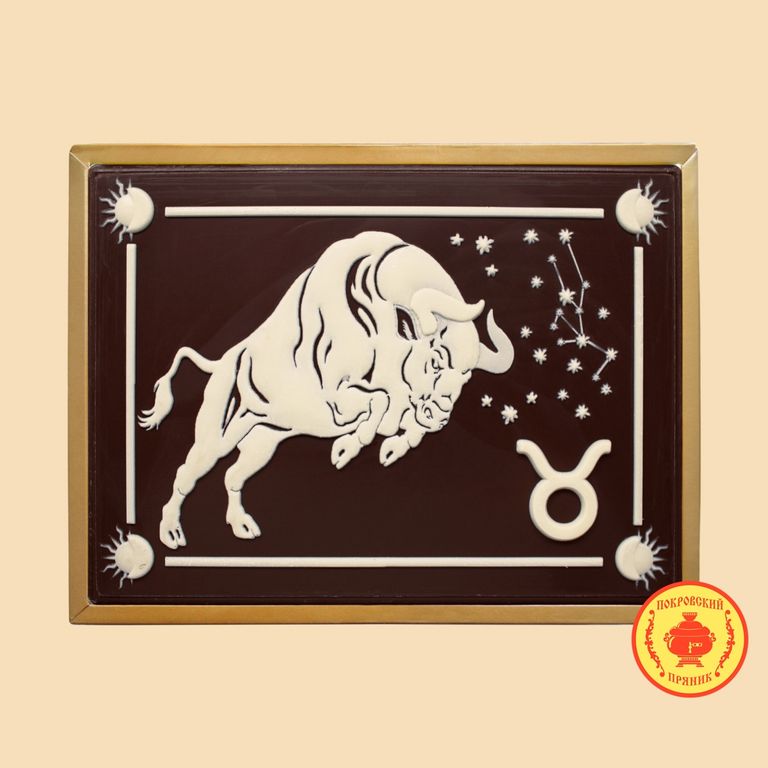 Пряник в темной шоколадной глазури, оформленный темным и белым шоколадом с начинкой из вареной сгущенка и грецкого ореха