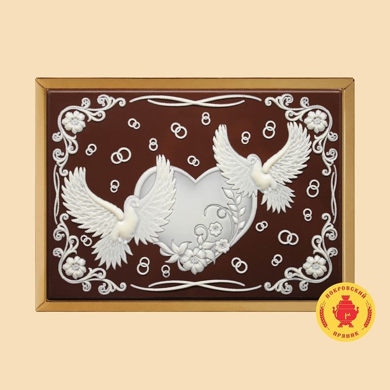 Пряник в темной шоколадной глазури, оформленный темным и белым шоколадом с начинкой из вареной сгущенка и грецкого ореха
