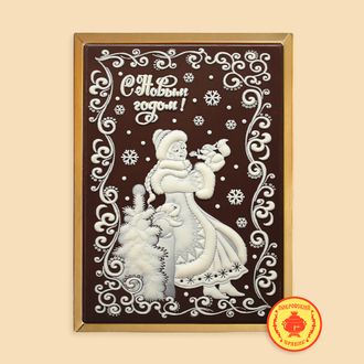 Пряник в темной шоколадной глазури, оформленный темным и белым шоколадом с начинкой из вареной сгущенка и грецкого ореха