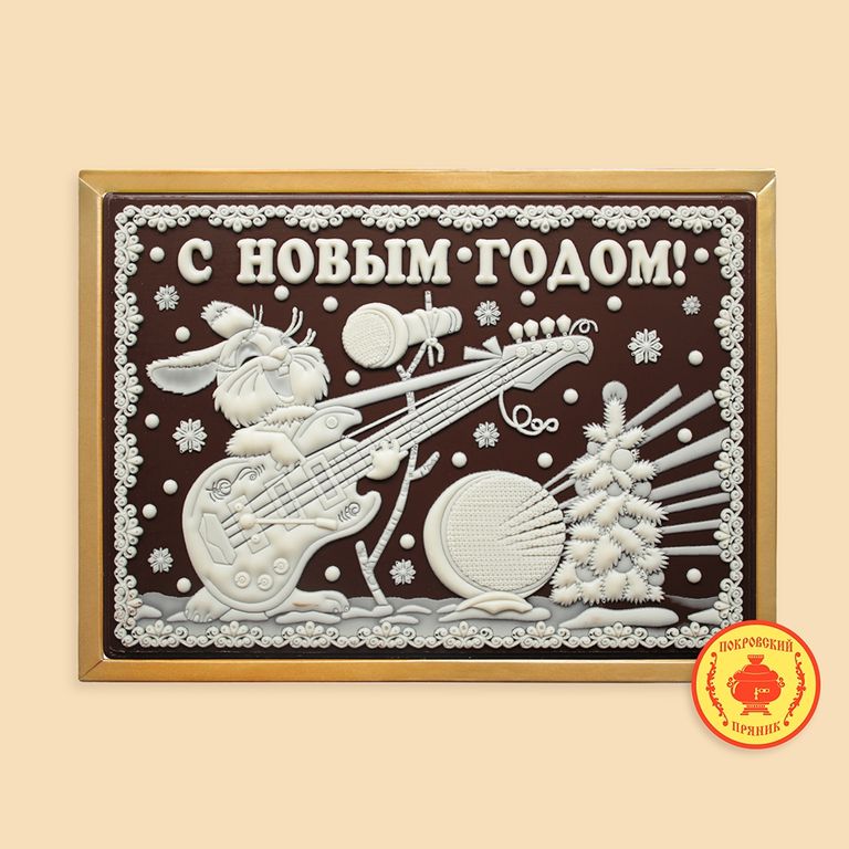 Пряник в темной шоколадной глазури, оформленный темным и белым шоколадом с начинкой из вареной сгущенка и грецкого ореха