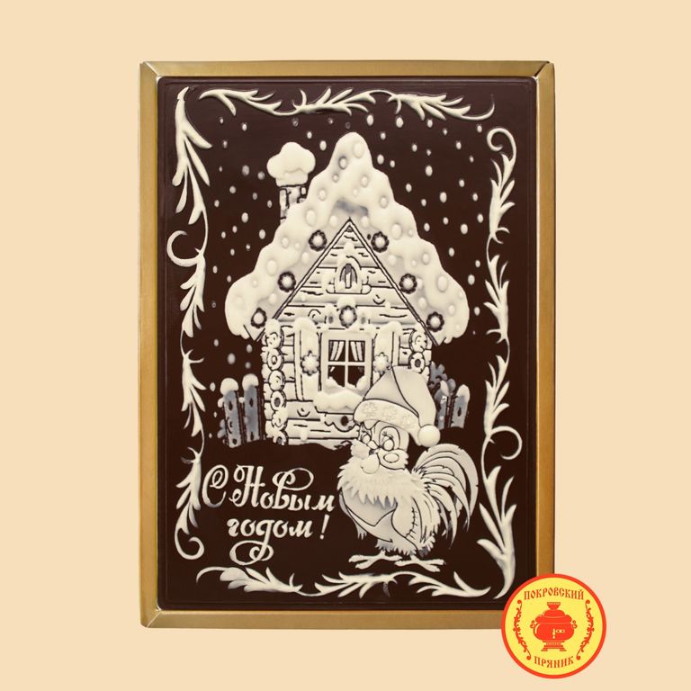 Пряник в темной шоколадной глазури, оформленный темным и белым шоколадом с начинкой из вареной сгущенка и грецкого ореха