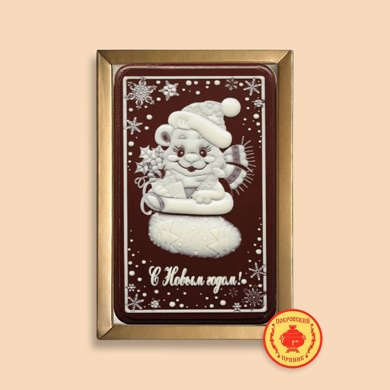 Пряник в темной шоколадной глазури, оформленный темным и белым шоколадом с начинкой из вареной сгущенка и грецкого ореха