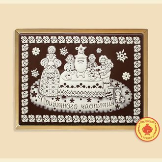 Пряник в темной шоколадной глазури, оформленный темным и белым шоколадом с начинкой из вареной сгущенка и грецкого ореха