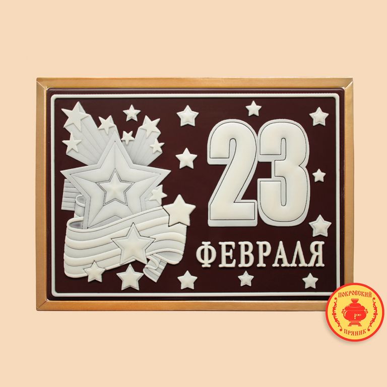 Пряник в темной шоколадной глазури, оформленный темным и белым шоколадом с начинкой из вареной сгущенки и грецкого ореха