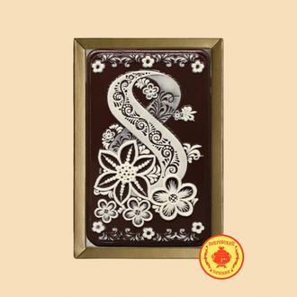 Пряник в темной шоколадной глазури, оформленный темным и белым шоколадом с начинкой из вареной сгущенки и грецкого ореха