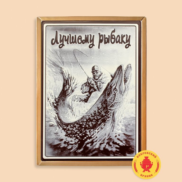 Пряник в темной шоколадной глазури, оформленный темным и белым шоколадом с начинкой из вареной сгущенки и грецкого ореха