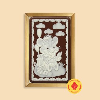 Пряник в темной шоколадной глазури, оформленный темным и белым шоколадом с начинкой из вареной сгущенки и грецкого ореха