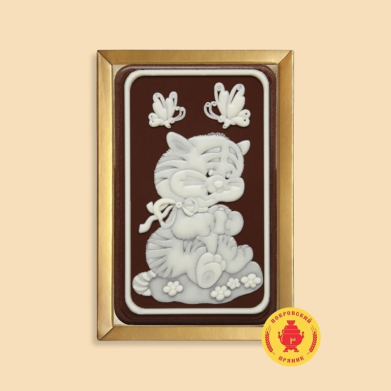 Пряник в темной шоколадной глазури, оформленный темным и белым шоколадом с начинкой из вареной сгущенки и грецкого ореха