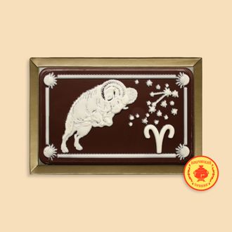 Пряник в темной шоколадной глазури, оформленный темным и белым шоколадом с начинкой из вареной сгущенки и грецкого ореха