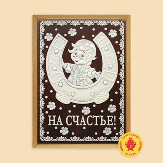 Пряник в темной шоколадной глазури, оформленный темным и белым шоколадом с начинкой из вареной сгущенка и грецкого ореха