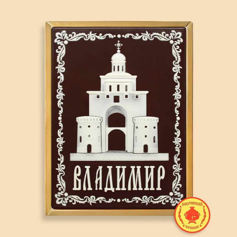 Пряник в темной шоколадной глазури, оформленный темным и белым шоколадом с начинкой из вареной сгущенка и грецкого ореха