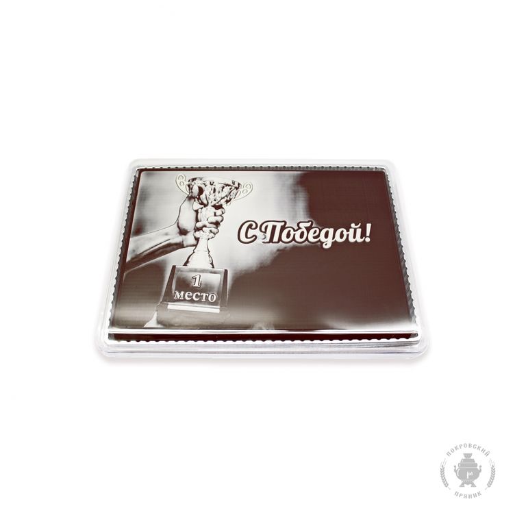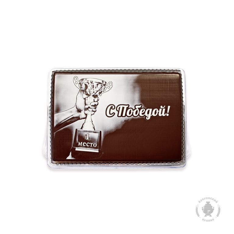 Пряник в темной шоколадной глазури, оформленный темным и белым шоколадом с начинкой из вареной сгущенка и грецкого ореха
