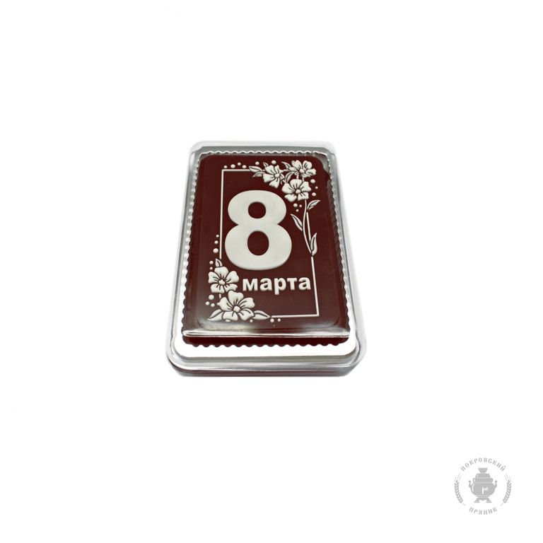 Пряник в темной шоколадной глазури, оформленный темным и белым шоколадом с начинкой из вареной сгущенки и грецкого ореха