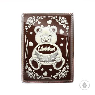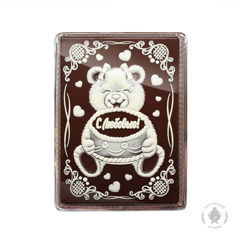 Пряник в темной шоколадной глазури, оформленный темным и белым шоколадом с начинкой из вареной сгущенка и грецкого ореха